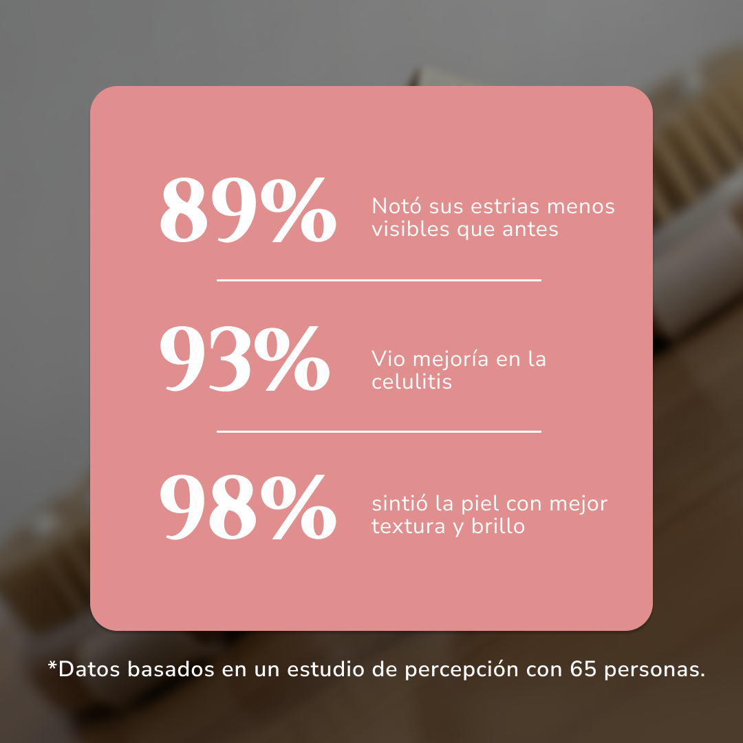 Con un cepillo de cerdas naturales ultrafinas, pasa el cepillo sobre la piel desnuda con movimientos suaves y circulares. Es mejor hacerlo antes de ducharte; tanto la piel como el cepillo deben estar secos. Por lo general, recomendamos hacerlo una vez a la semana.