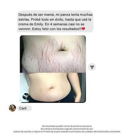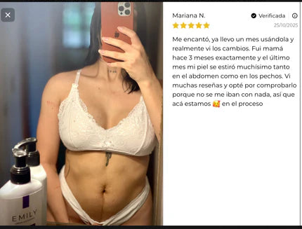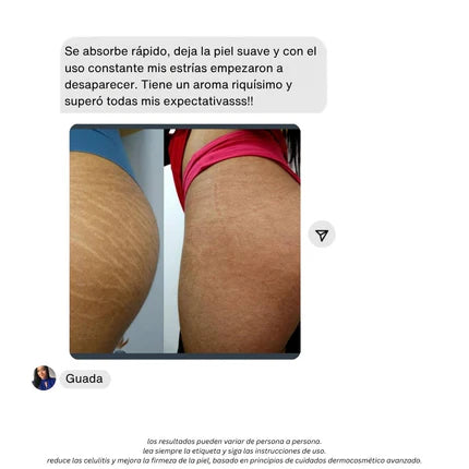 Muchas usuarias notan la piel más hidratada y uniforme dentro de las primeras semanas. Con el uso constante durante 30 días, el aspecto de las estrías se atenúa visiblemente.