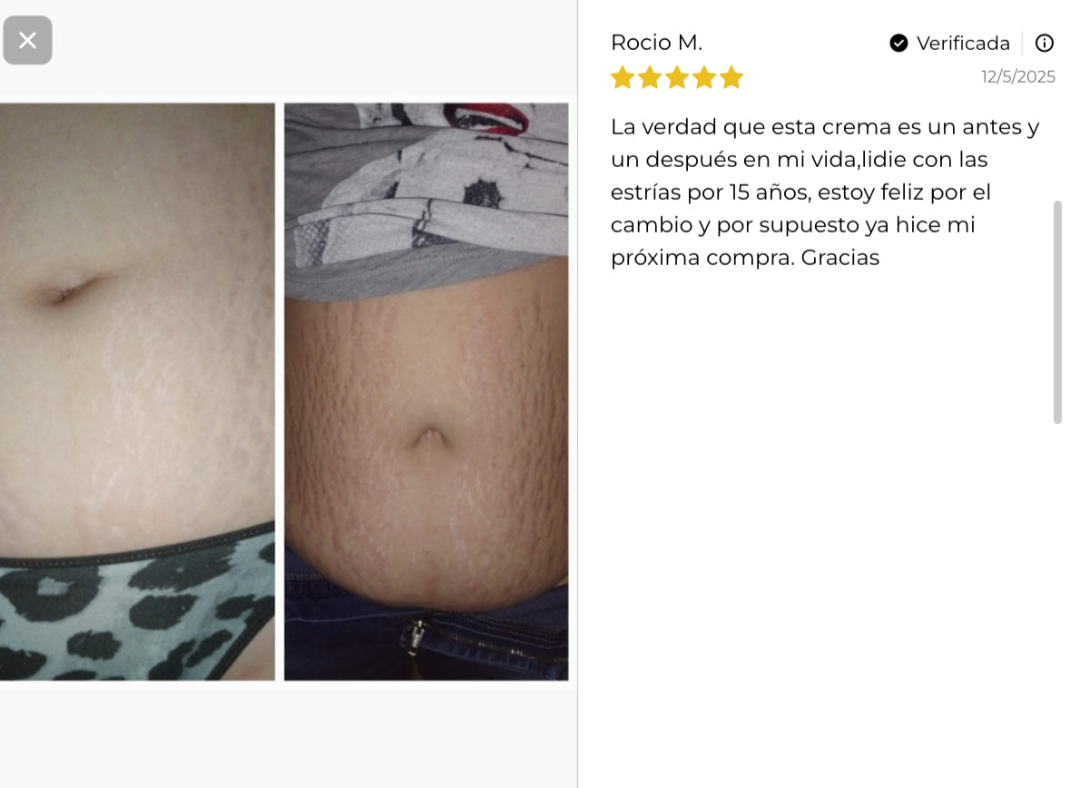 La crema ayuda a reducir la visibilidad de las estrías por sí sola, pero sus efectos se potencian con una buena hidratación, alimentación saludable y actividad física regular.
