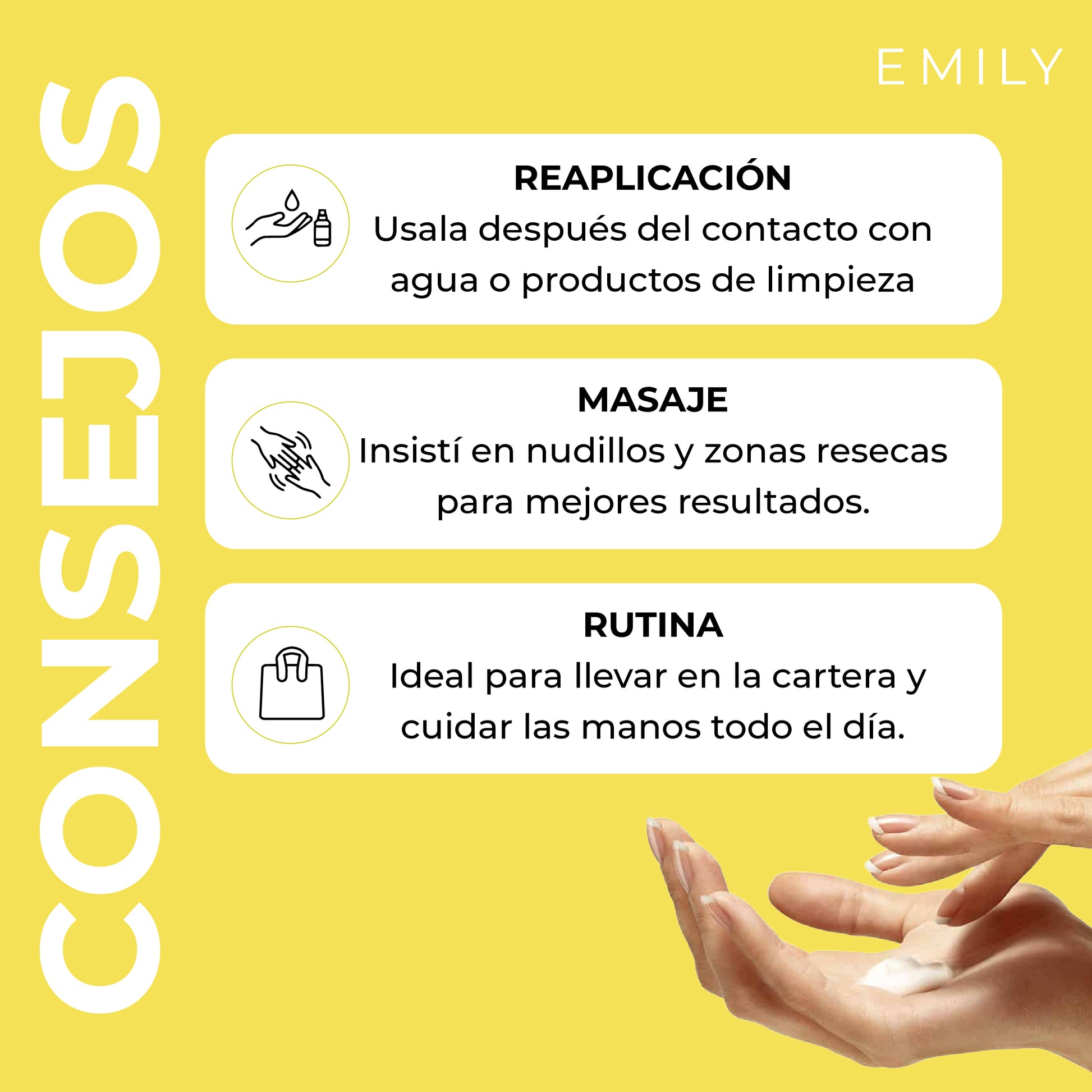 Podés usarla varias veces al día, especialmente después de lavarte las manos o cuando notes resequedad. Su textura ligera permite reaplicarla sin dejar sensación grasosa.