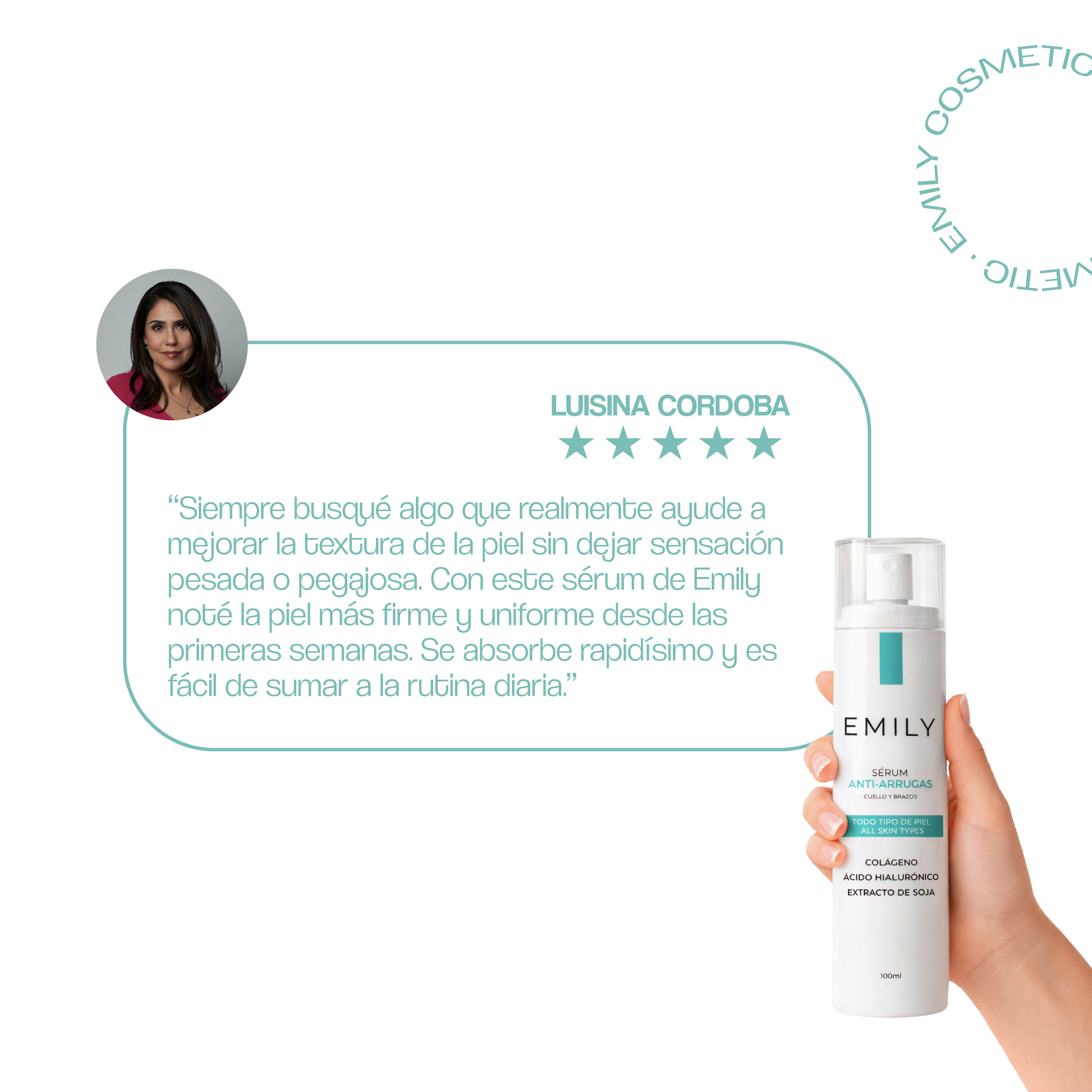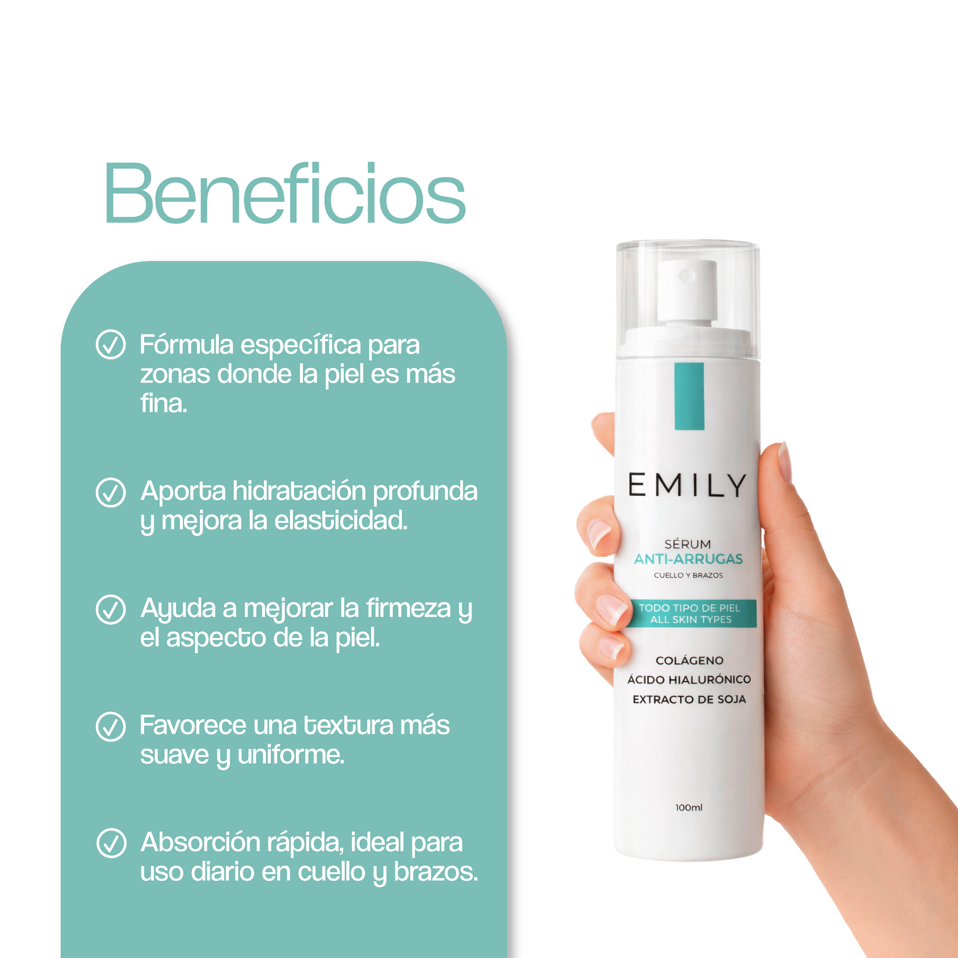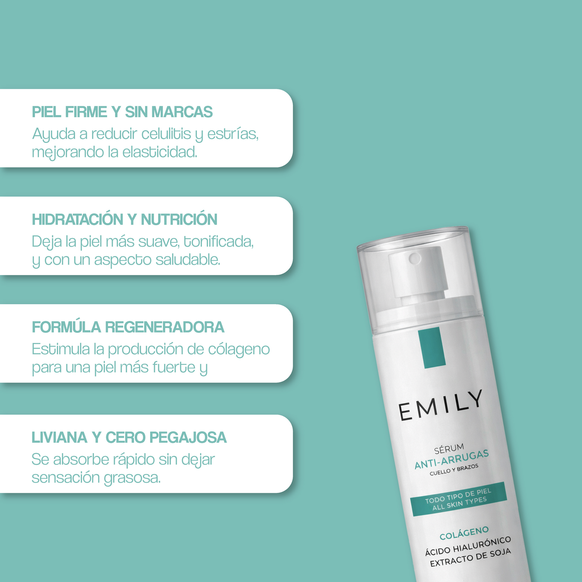 En estudios clínicos con mujeres de más de 40 años, en apenas 8 semanas de uso del sérum antiarrugas para cuello y brazos notaron la piel más firme, con menos arrugas y una elasticidad que se traduce en un aspecto más joven.